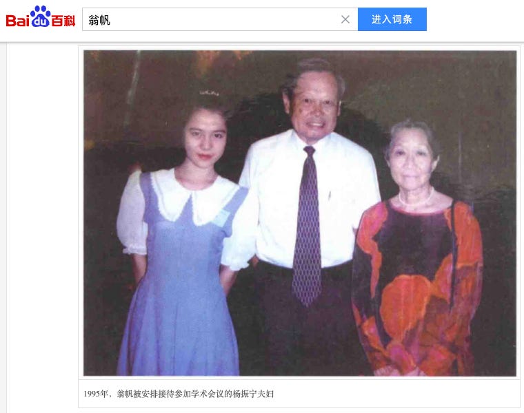 记得不久前还有杨振宁在家里听翁帆唱昆曲的视频。杨是安徽人,以前也从没有翁帆喜欢唱戏的说法,她一个南方人喜欢戏剧的概率远不可能有安徽出生的杨振宁高,多半也是为取悦杨学的。也再次可以看到她这二十年都在忙些什么——为了杨的兴趣爱好团团转,是她生活的常态。杨主人确实被她照顾得够好,也可能还使用了阅兵时候习普讨论的高科技,器官移植,来延年益寿吧。