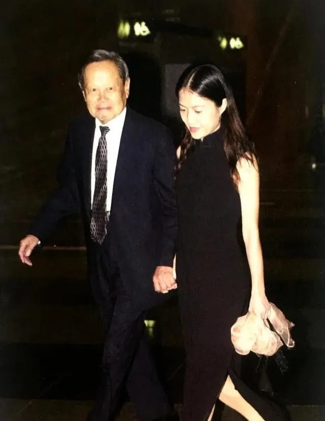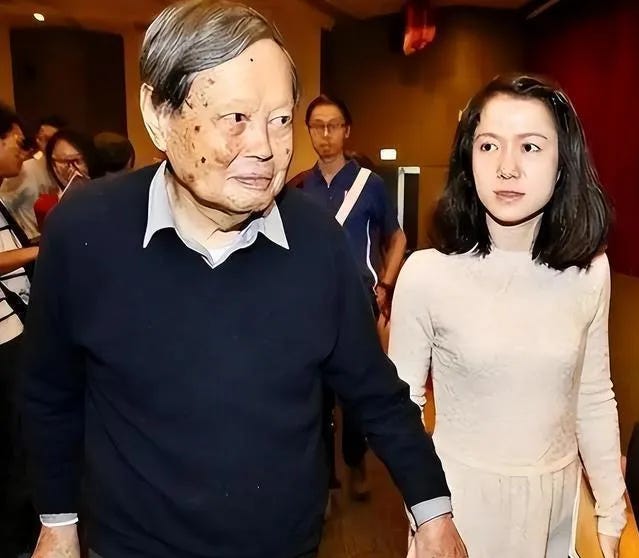 其实杨振宁是在2004年,原配杜致礼去世不到一年后,就跟翁帆订婚,一个月后正式结婚。杜致礼原本比杨小好几岁,是国民党名将杜聿明的女儿,也是杨振宁在西南联合大学附属中学的学生。师生恋,当年的大家闺秀,被杨疯狂追求,最后却并不得长寿。夫妻中女的一般走得晚,但她却比杨早很多年。恐怕家务、孩子全靠她,累到身体弱。
