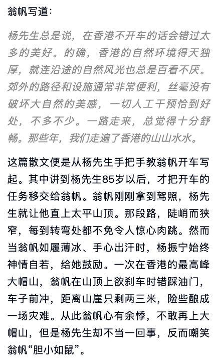 杨振宁85岁以后,才把开车的任务移交给翁帆。翁帆刚刚拿到驾照,杨振宁就让她直上太平山顶。那段路,陡峭而狭窄,每到转弯处都不免令人惊心肉跳。当翁帆如履薄冰、手心出汗时,杨振宁始终神情自若,给她鼓励。一次在香港最高峰大帽山,翁帆在山顶上欲刹车时错踩油门,车子前冲,距离山崖只剩两三米,险些酿成一场灾难。从此翁帆心有余悸,不敢再上大帽山,但是杨振宁却不当一回事,反而嘲笑翁帆“胆小如鼠”[36] 。”