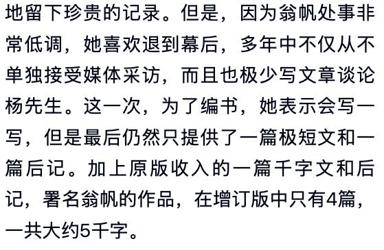 即使所有吹捧这个婚姻的文章,也无法回避翁帆鲜言少语评论杨振宁的事实,比如这篇(下图)。翁帆的生活,不仅要扮演贤妻的角色,还必须维持伟大科学人物身边女性的正面积极的公众形象。她的沉默与克制,正说明了这种婚姻关系中对个人真实情感的系统性压制。
