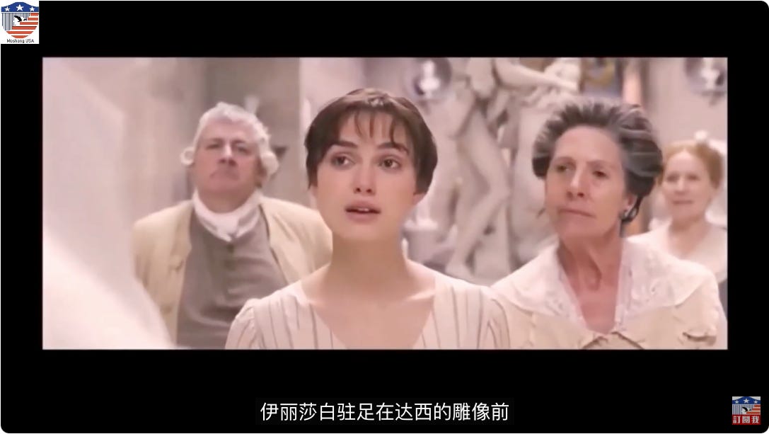 在参观艺术品的过程中,伊丽莎白驻足在达西的雕像前,流露出从没有有过的痴迷。她第一次有勇气和心境去感受,这位绅士是如此英俊。不过她的勇气只是止于对着雕像展示真性情。陷入恋爱中的人的这种微妙心理,被诠释得淋漓尽致。受过此类牵肠挂肚的人,都懂。