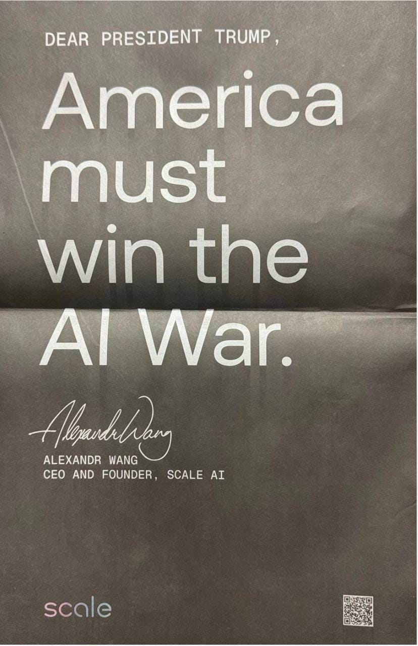 数月前,Alexandr汪在《华盛顿邮报》买下整个版面的广告,呼吁“美国必须赢得AI之战(America must win the AI War)”。随后,他受邀出席国会AI听证会,Trump也致函他出席中东之行。在美国所有顶级高科技大佬都露面的这场为AI发展谋求投资的高规格出访中,他年轻的面孔,站在了美国科技叙事的最前沿。