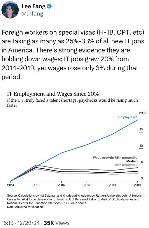 多年来,移民问题在左派阵营中被视为神圣不可侵犯,因为它常常被赋予种族视角——拒绝移民被认为是一种种族歧视。然而,至少在H-1B签证问题上,这种观点是错误的。任何人只要走进一间计算机科学本科课堂就会发现,这个专业的学生主要是亚裔美国人。因此,以H-1B持有者大多是亚裔为由而拒绝限制该签证项目,实质上是混淆视听,因为H-1B制度的主要受害者也是亚裔。此外,有些人声称对H-1B签证的批评掩盖了白人美国人对印度裔的“反印度教”情绪,但事实并非如此。早期的H-1B签证持有者主要是东欧人,而当时对该项目的批评同样激烈。