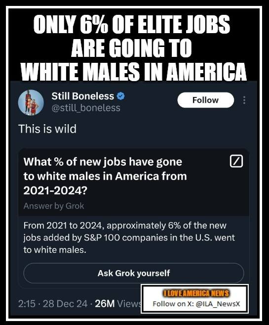 拜登政府执政期间,许多新增就业岗位不成比例地流向了移民(许多是非法移民)——数据显示,美国百强企业的白人男性员工比例仅占6%。