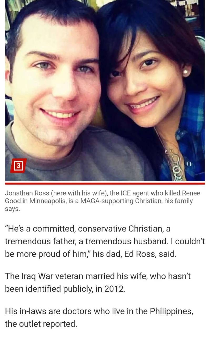 今天,击毙Good的明尼苏达ICE执法人员的个人信息也被媒体披露。名叫Jonathan Ross,是名伊战老兵,在ICE工作12年,妻子为菲律宾裔,岳父母在菲律宾当医生。Ross的爸爸评价自己儿子时说,Jonathan是名“保守派基督徒,了不起的父亲和丈夫”。读者群评论,“这种人是勇者。参加过伊战的很多都有战后PTSD,不少都能在家躺平过下半生。能在LEO(law enforcement office)一线做十二年的,很难得。”