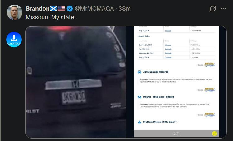 网上曝光了她用的确实是密苏里的车牌。