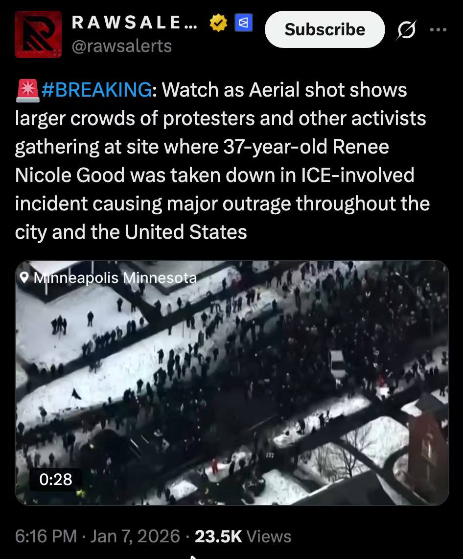 2026年1月7日,明尼苏达州双城,也就是2020年BLM暴乱几乎同一的地方,发生一起反ICE抗议分子被执法人员开枪致死的命案。