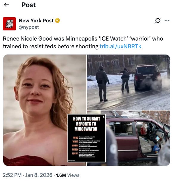1月9日更新:越来越多的证据显示,这是一场左翼组织专门培训成员破坏ICE执法大背景下,玩火自焚式的悲剧。后续调查需要重点放在这些NGO组织的经费来源,走向和使用上,查明到底是什么力量在鼓动美国式“敌后武工队”碰瓷,破坏ICE正常守卫国家安全的行动,并往美国内战的方向引战。