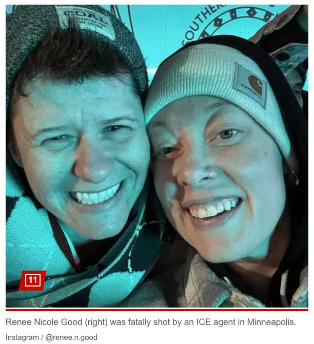 冲击ICE被击毙的死者身份已经被确认,名叫Renee Good,37岁,采用she/her的pronoun(代词),其自媒体信息表明她是一位从事人文专业、LGBTQ身份的左翼人士。根据CNN、AP、WAPO几家媒体的报道,她在科罗拉多州出生长大,第一次婚姻有15岁和12岁的两个孩子,在离婚中失去了两个孩子的抚养权;跟第二任丈夫有个6岁孩子,而这个丈夫于2023年自杀身亡。Renee年轻时候还是个基督徒,但是现在却成了一个女同志,跟她的同性恋女伴两人先是因为TDS(恐川普症)去了加拿大,随后定居在密苏里的堪萨斯城,最近才新搬到明尼苏达。