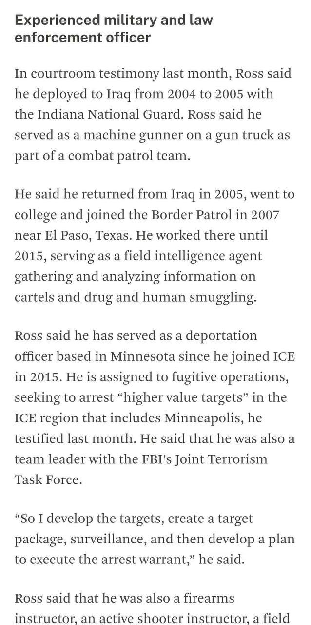 从媒体的描述来看,Ross是真正为美国打过战的老兵,在2004-05年伊战战场一线当炮兵。05年退役后,他先是读了大学之后加入边防工作,在德州El Paso一直干到2015年。随后,他作为情报人员,负责侦查毒枭和人口贩子。2015年加入ICE之后,他一直在明尼苏达州从事相关的工作,专门缉查高危非法移民犯罪分子,作为队长常跟FBI反恐小组合作。平常生活中,Ross也是名武器器械专家,兼任射击教官。